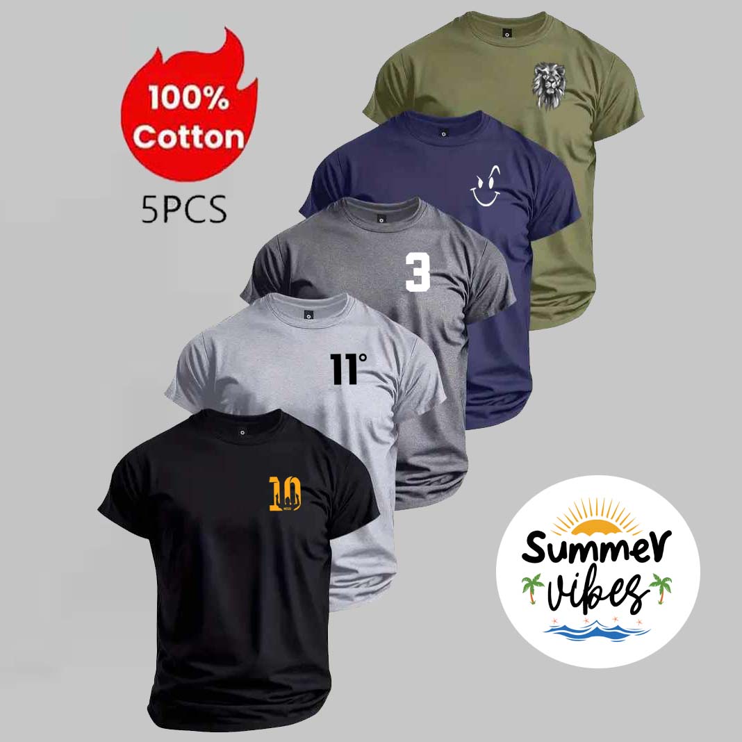 Bundle Of 5 R-Neck Half Sleeve PL-Printed Summer Tshirt's. (Black-Navy-H.Grey-C.Grey-Green)